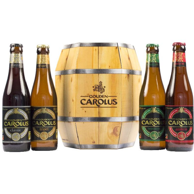 Deze stevige kartonnen verpakking heeft een authentieke houtlook. De Gouden Carolus Bierton bevat een mix van 4 Gouden Carolus bieren: