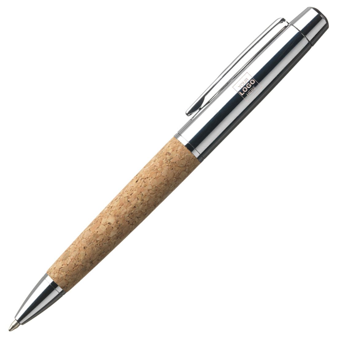 Blauwschrijvende, metalen balpen met een gepolijste, supergladde chroom finish. Het voorstuk is opvallend mooi afgewerkt met kurk. De pen heeft een draaikliksysteem. Per stuk in een mooie, bijpassende cassette met kurken accent. Een opvallend chique set.