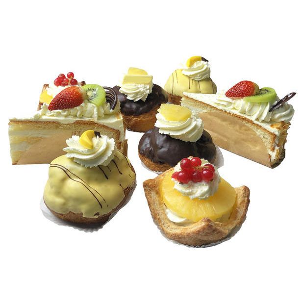 Voorzie dit heerlijke slagroomgebak eens van je logo of foto, zodat je presentatie nog leuker wordt. Een assortiment van heerlijk, vers slagroomgebak: moorkoppen, slagroompunten, ananasschelpen en bananensoezen. Vanaf 6 stuks. Het gebak kan bedrukt worden met logo, dit is al bij de prijs inbegrepen.